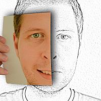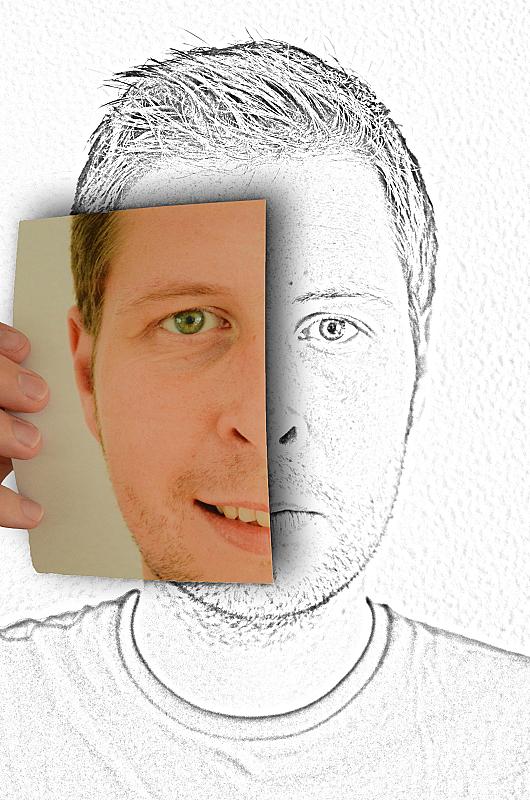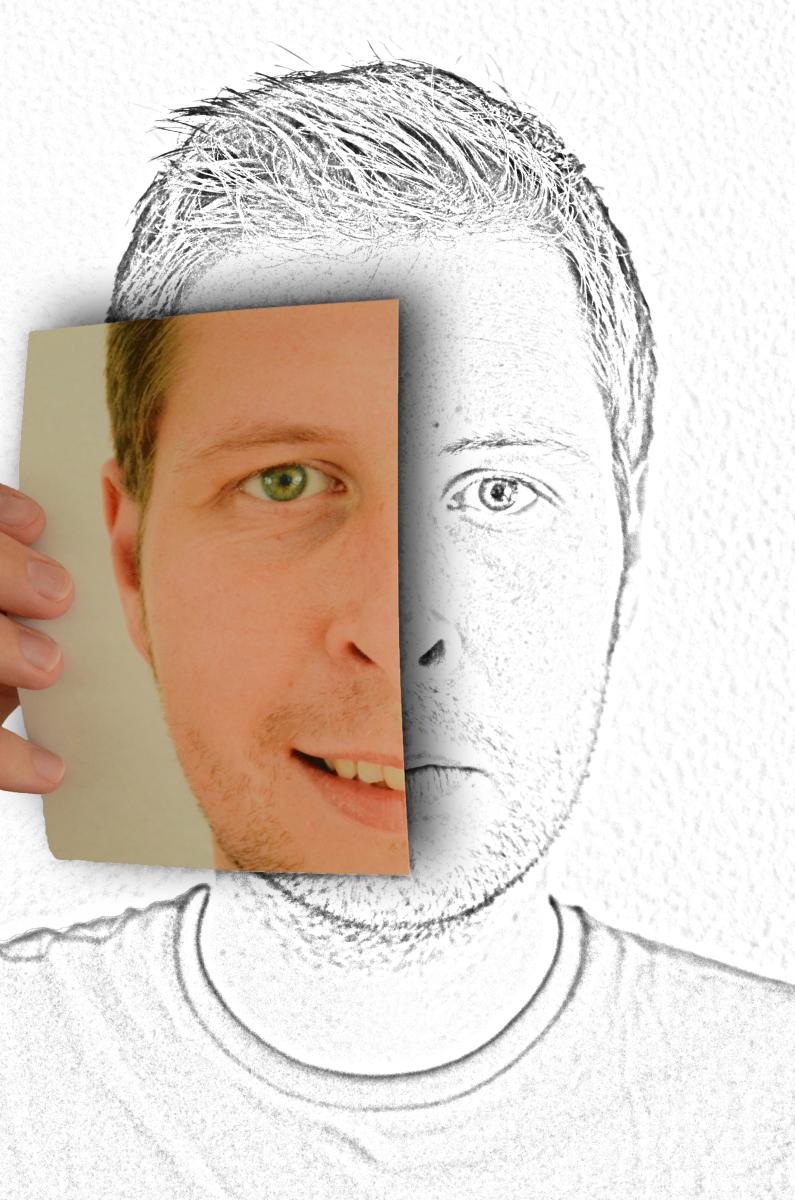 Eerst heb ik een foto van mezelf gemaakt en deze geprint. Vervolgens heb ik die geprinte foto voor m'n gezicht gehouden om de tweede foto te maken. In de nabewerking heb ik een internettutorial gevolgd om mezelf in een schets te veranderen.