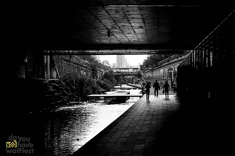 Seoul is een zeer drukke stad, het is zeer moeilijk om deze rustig te voet te doorkruisen. Ze hebben er wel enkele creatieve manieren op gevonden om het toch wat aangenamer te maken. Zoals dit wandelpad gemaakt tussen de drukke straten in. Normaal heel kleurrijk maar door de grijze dag, toch zwart wit!