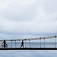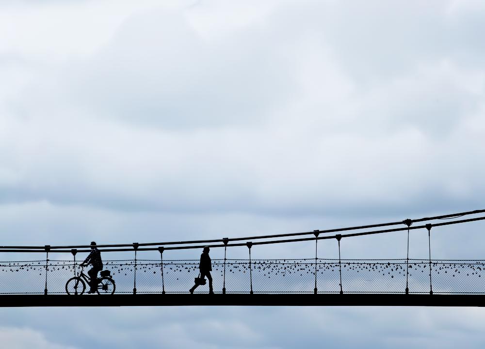 De voetgangersbrug van Stadt Minden vormt tegen de achtergrond van de lichte lucht een mooi schouwspel van mensen die komen en gaan.
