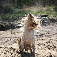 Heerlijk zichzelf aan het uitschudden na het rondrennen in water en modder. Je ziet het zand letterlijk uit zijn haren vliegen.