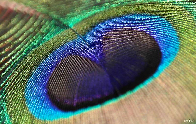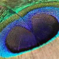Een pauwenveer, glanzend in het ondergaande zonlicht.