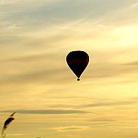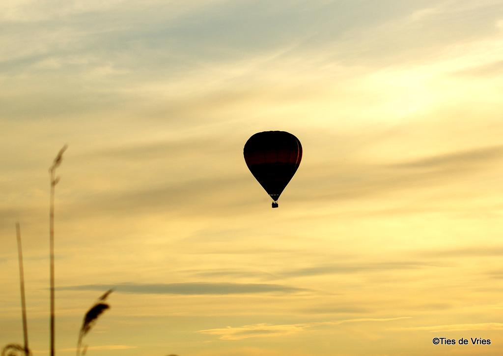 Een luchtballon in de, door een ondergaande zon, geel/oranje gekleurde lucht