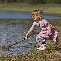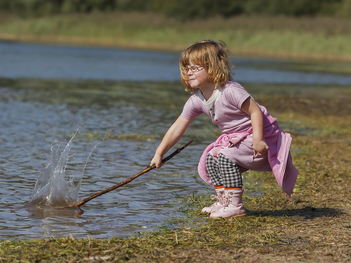 Mijn jongste dochter had veel plezier met het op het water slaan met een stok zodat het water omhoog kwam. Wel met de oogjes dicht natuurlijk. :)