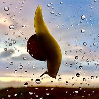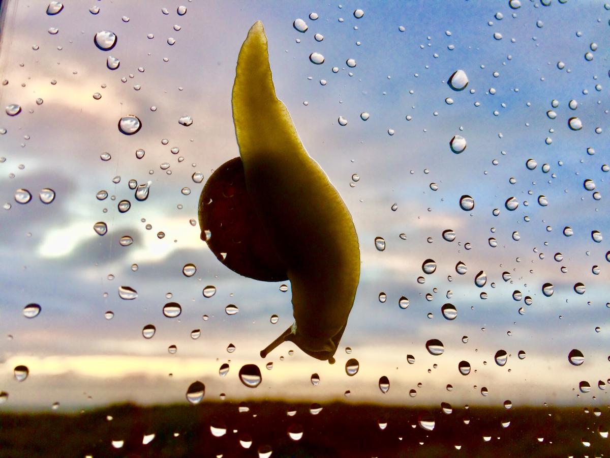 Slak bekijkt de omgekeerde wereld in de regendrups