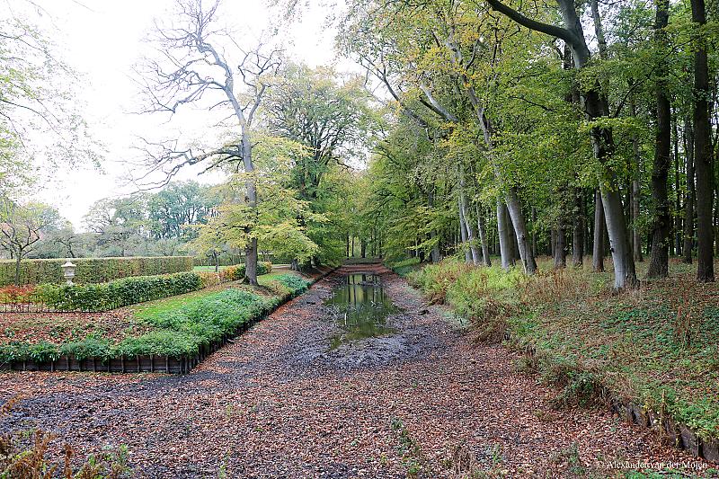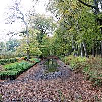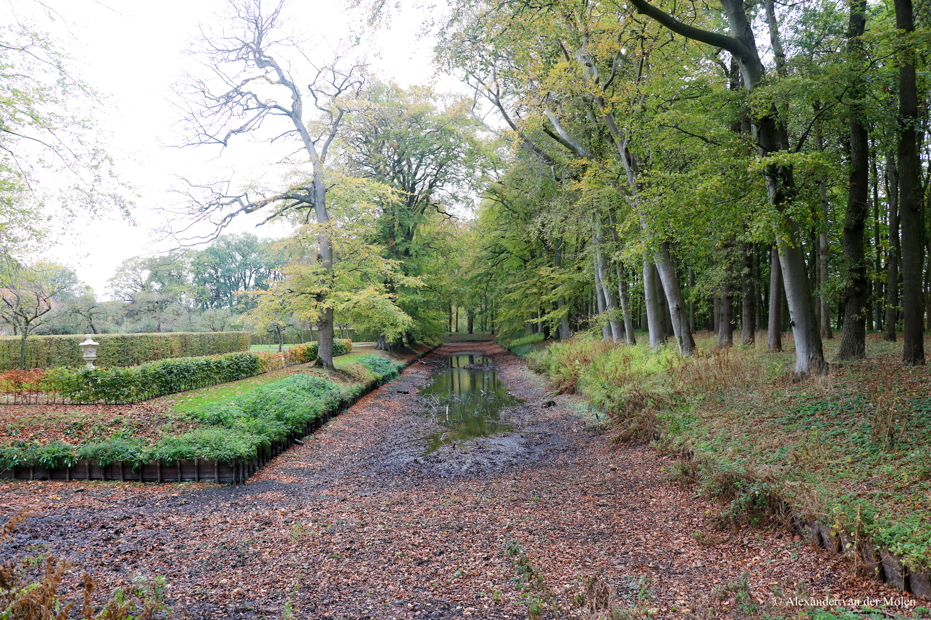 De slotgracht van de Menkemaborg is droog en gevuld met herfstbladeren