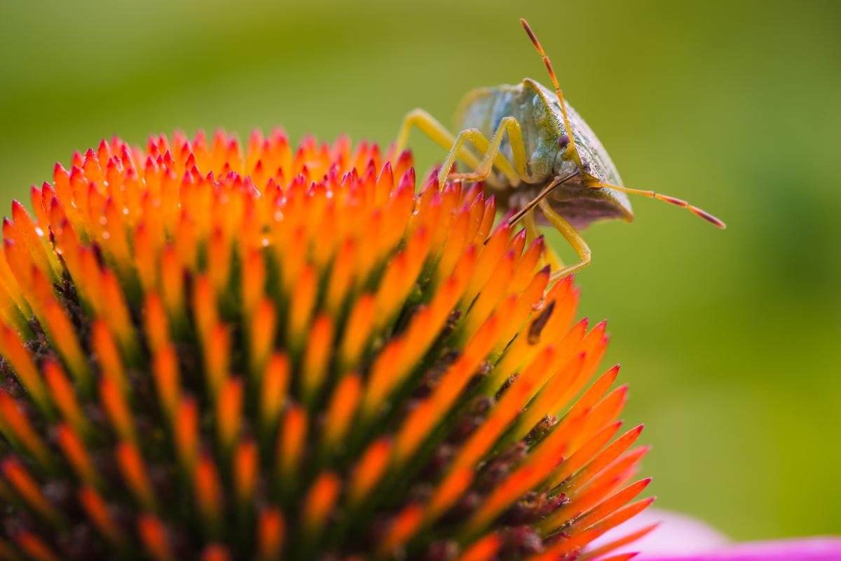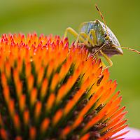 De groene schildwants is in de zomer groen en in de winter bruin. Hier zuigt hij nectar uit de bloem van de Zonnehoed.