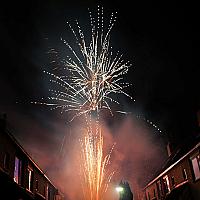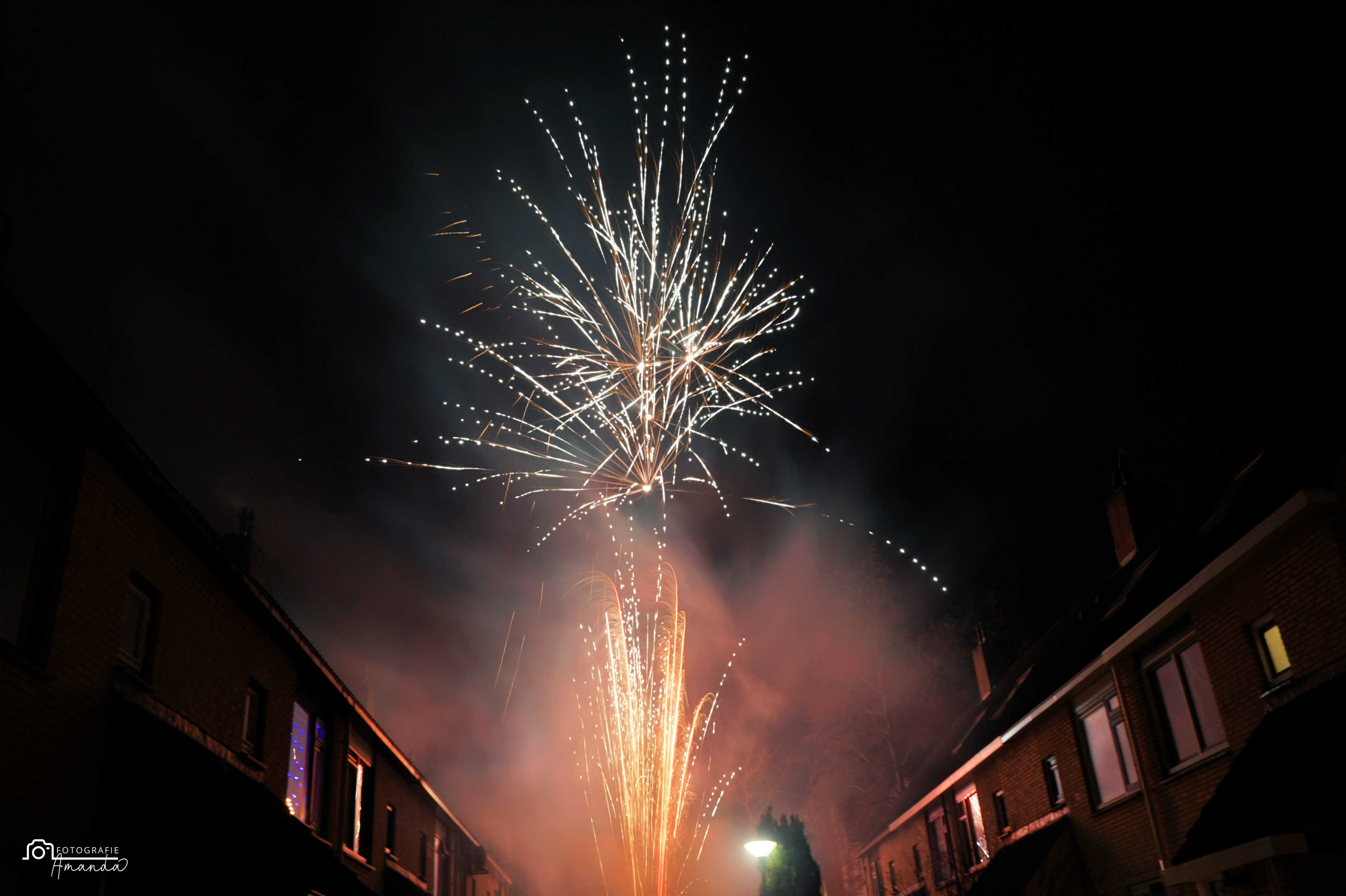Het zicht op de vuurwerkshow vanuit onze straat, wat een geweld en wat een rook. Gelukkig belemmerde de rook het zicht op het vuurwerk verder niet, ik vond het wel iets extra's geven aan deze foto.
