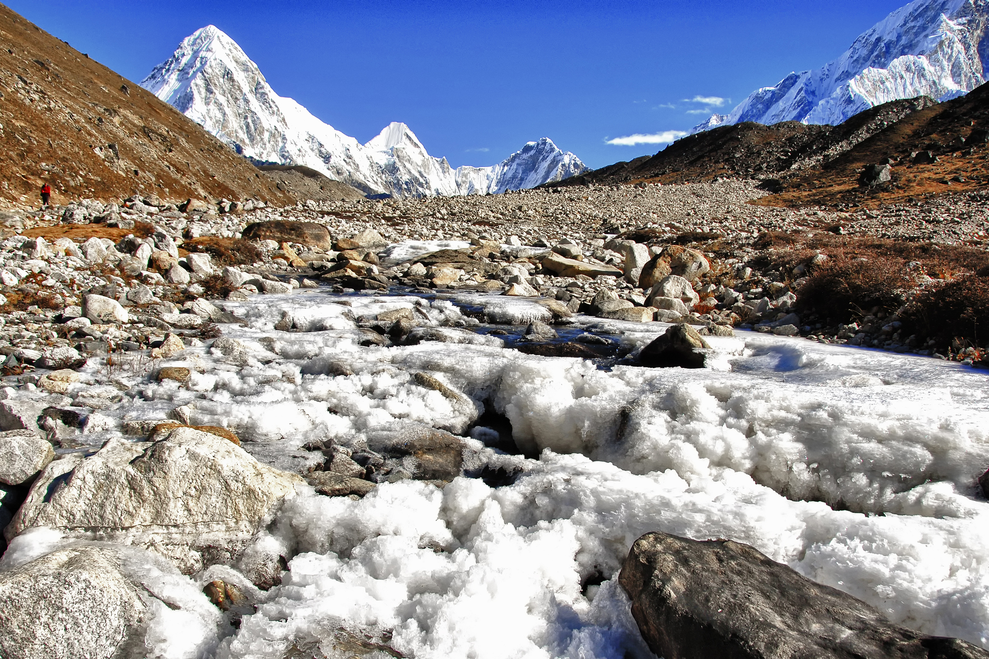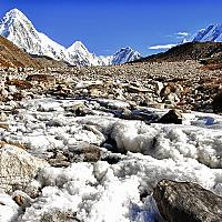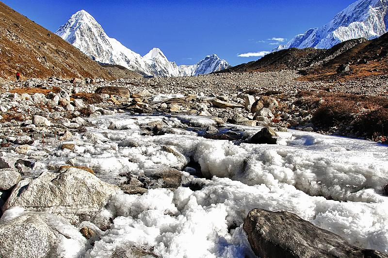 Deze foto laat een zijdal zien vlak voor de plaats Gorakshep dat op een hoogte van 5164m ligt. Je staat dan dus hoger dan het hoogste punt in Europa en natuurlijk merk je dat aan de beperktere hoeveelheid zuurstof.