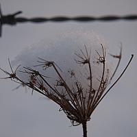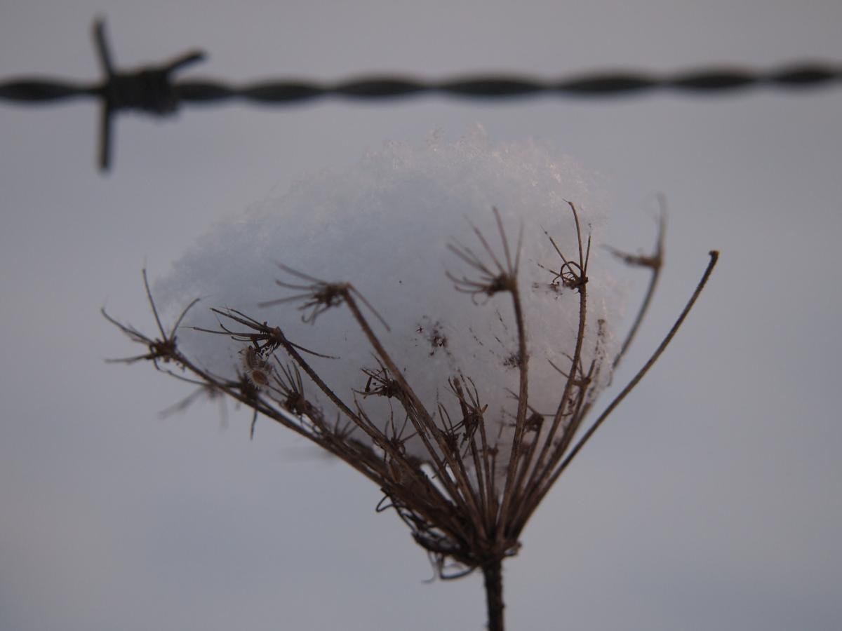 Een besneeuwd bloemscherm langs een weiland. Het zon was hier net onder gegaan, maar met de restjes licht van de schemering toch nog een mooie foto kunnen maken.