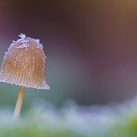 Bedekt met ijskristalletjes trotseert dit paddenstoeltje de winterkou.