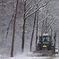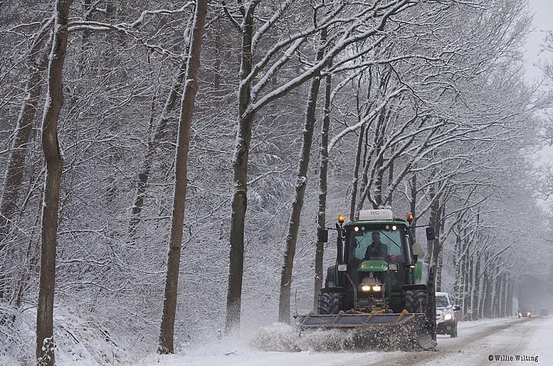 Goed bezig deze tractor, sneeuw schuiven en de weg strooien zodat het verkeer door kan rijden.