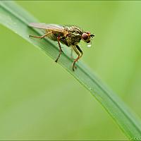 t' zou dus idd om een strontvlieg (Scathophaga stercoraria) gaan, ook wel drekvlieg genoemd, niet alleen aan de kleur maar ook herkenbaar aan de zwarte antennes .... euhmm weet niet of ik echt blij ben met die info