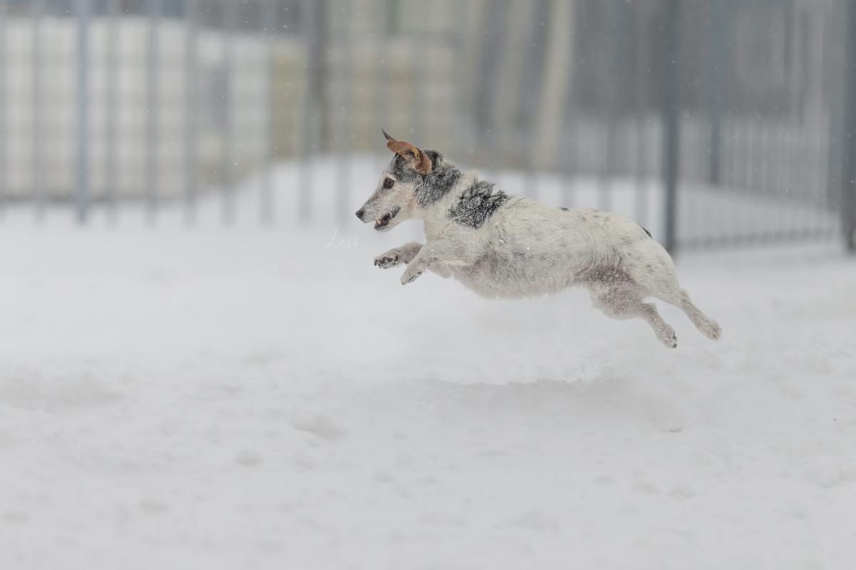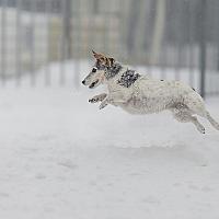 Nero mag dan wel op leeftijd zijn, maar toen de sneeuw tevoorschijn kwam begon hij rond te springen en rennen als een jonge hond!