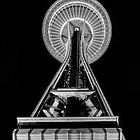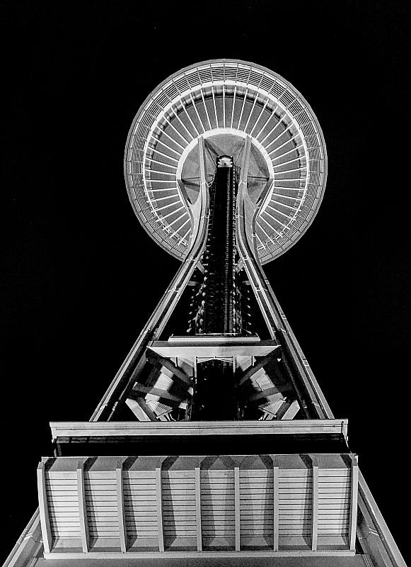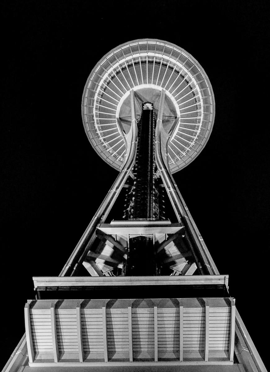Deze foto is genomen aan de voet van de spaceneedle in Seattle, tijdens een avondwandeling. Een heel leuk onderwerp om vast te leggen met het lijnen- en schaduwspel door de verlichting.