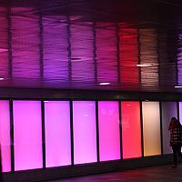 Hengelo centraal, reizigers in een fraai verlichte doorgang. Er is een spanning voelbaar.....