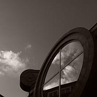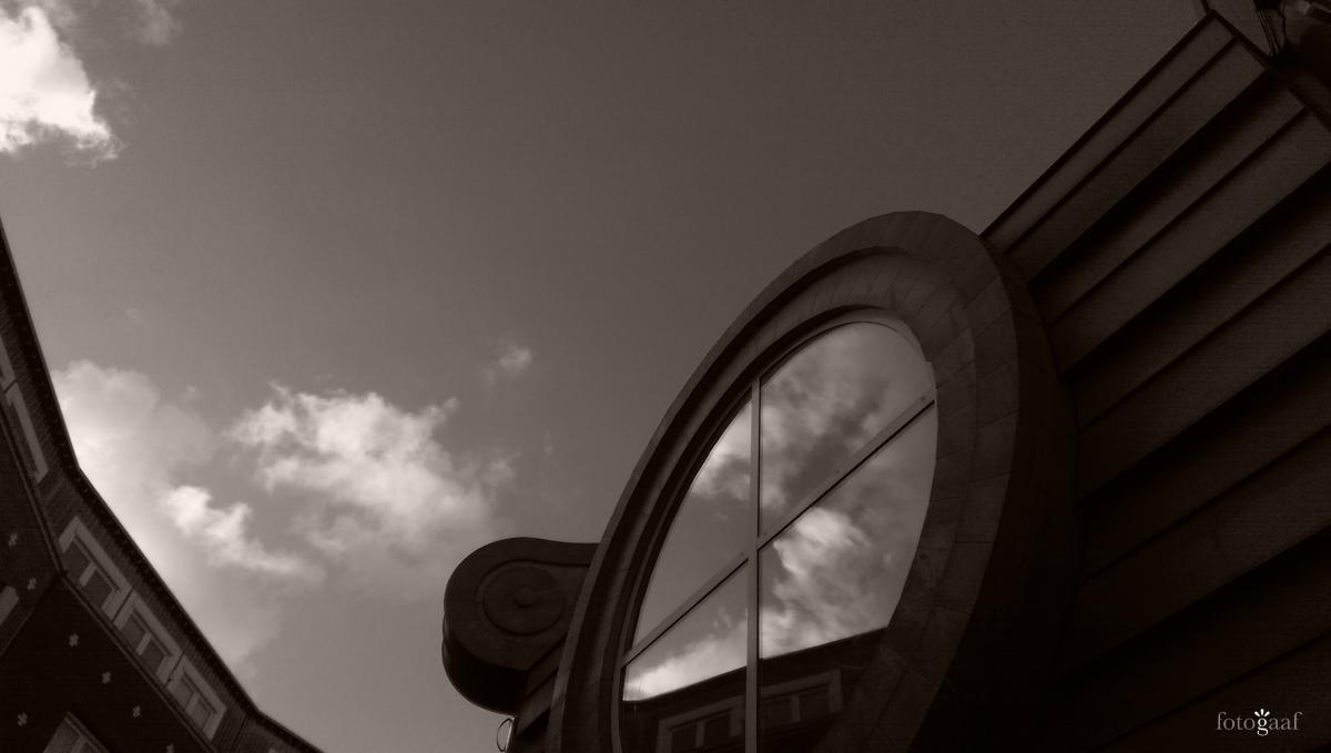 Zicht op een modern element in een winkelstraat. Prachtig de reflectie in het raam van dit winkelpland. Stijlvol in zwart/wit.