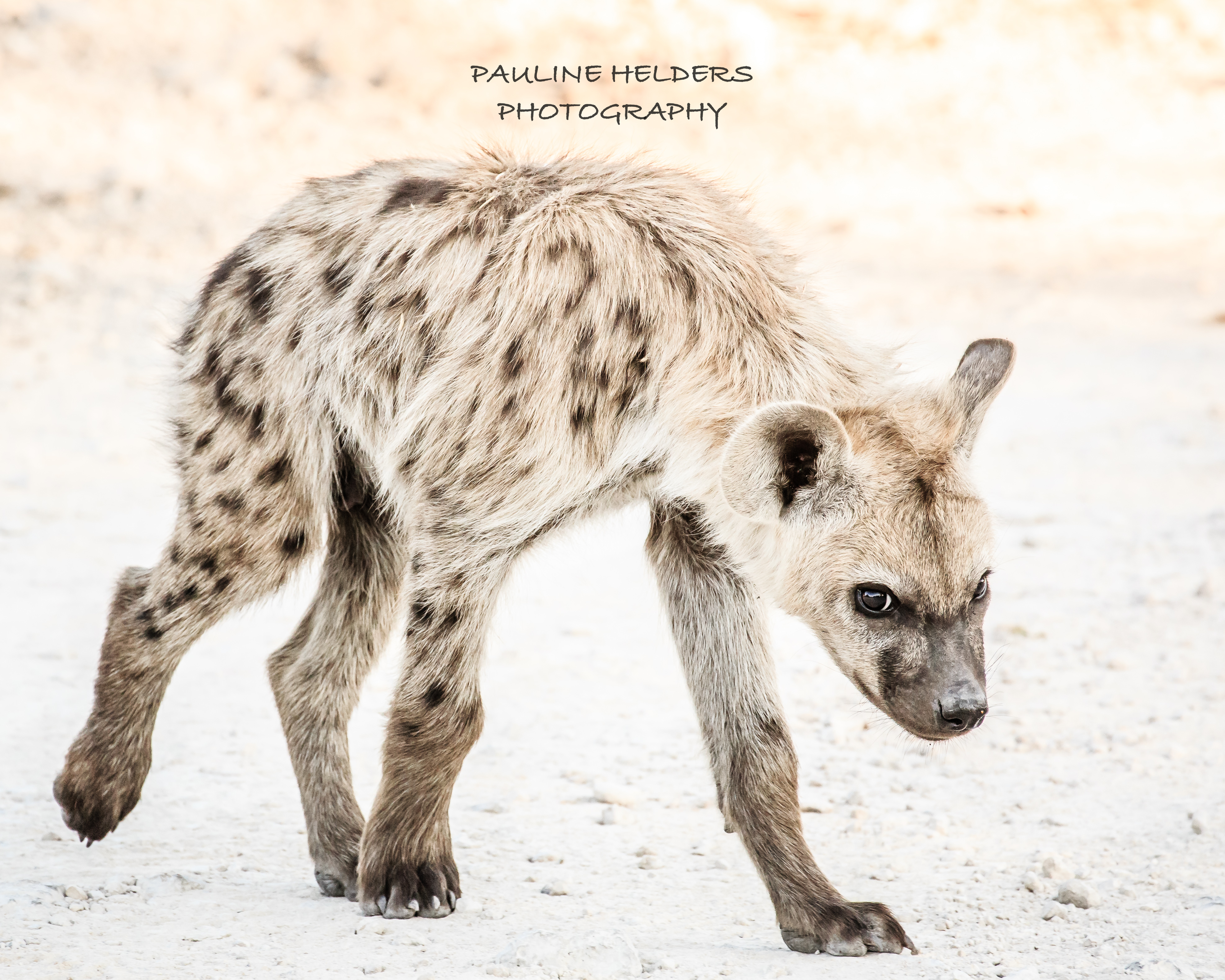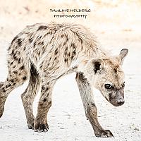Gespot in Etosha, Namibië, deze jonge spotted hyena. Speels en nieuwsgierig, hij kwam erg dicht bij onze auto.