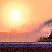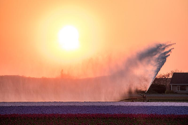 De bollenvelden worden gesproeid bij zonsondergang . Callantsoog