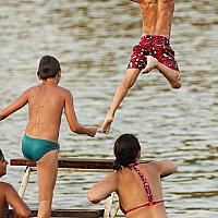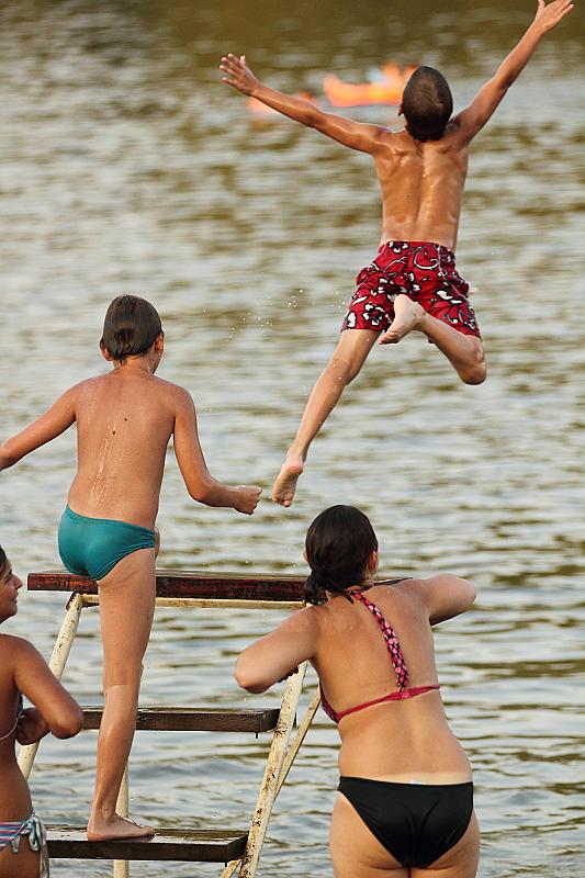 Enthousiaste kinderen springen in de Tisa-rivier, Ada, Servië, aug. 2012.