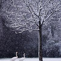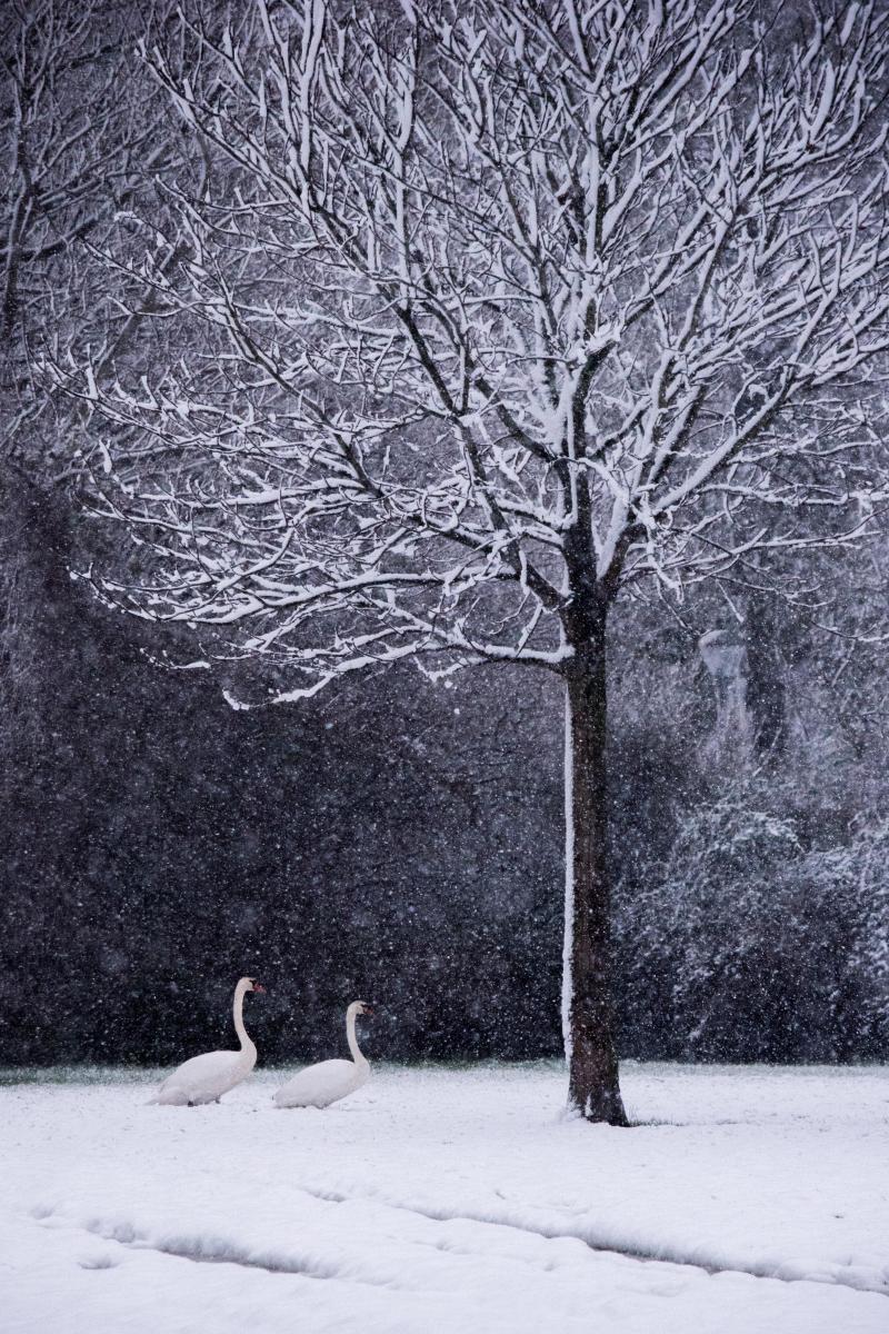 Een zwanenkoppel aan de wandel in een winterwonderland leverde een sprookjesachtig beeld op.