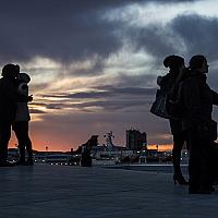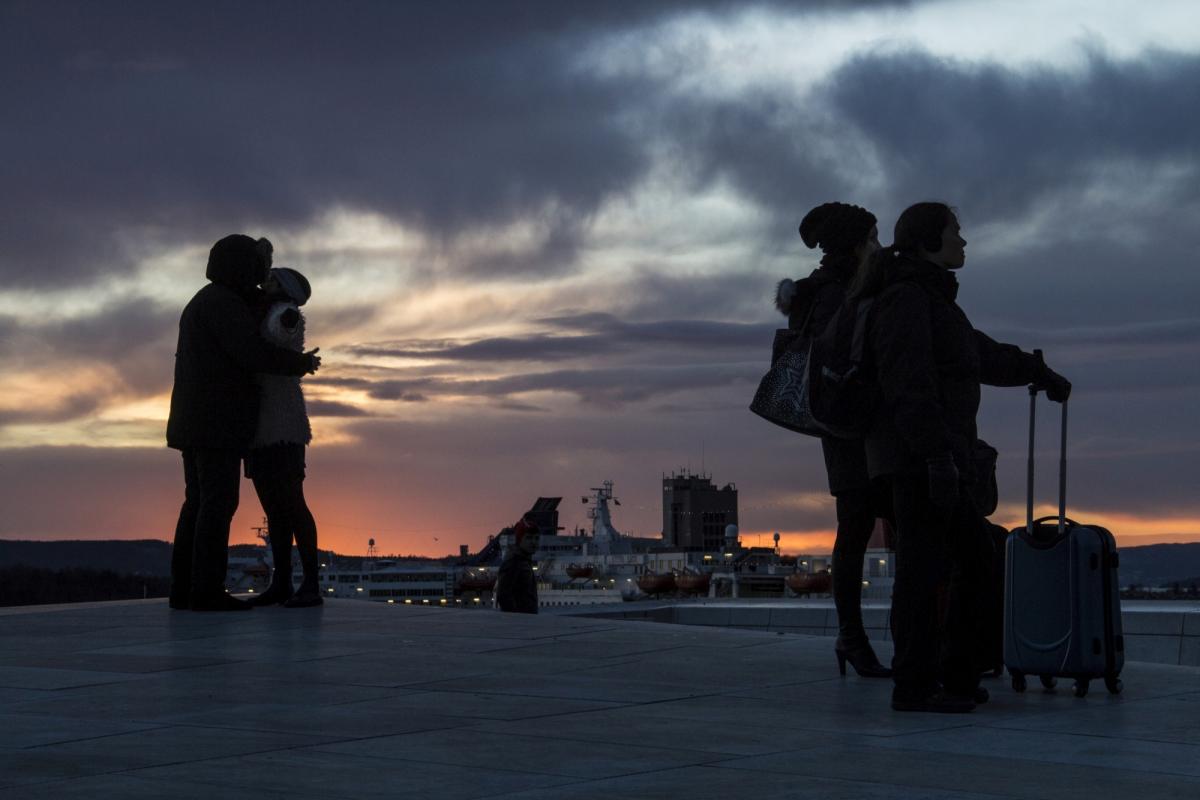Categorie Stedentrips: Deze foto is gemaakt op het dak van het operagebouw. Tegen drie uur gaat de zon al onder. Mensen genieten hier van het spectaculaire uitzicht over Oslo.