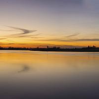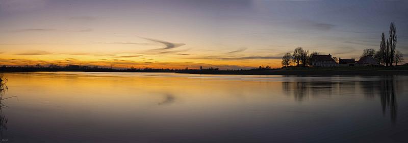 Een mooie winterse zonsondergang in het Limburgse Stevensweert met aan de overkant van de maas een blik op een Belgische boerderij.