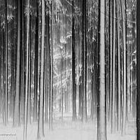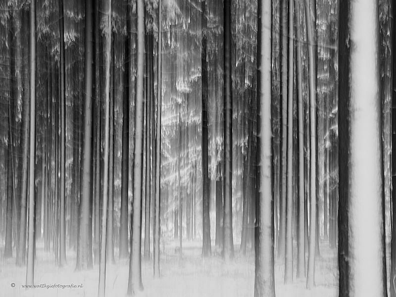 Het sneeuwde..........tijd om er op uit te trekken met de camera. In de buurt was een bos met vrijwel alleen naaldbomen, deze hadden mooie rechte stammen. Omdat het best hard sneeuwde bleef de sneeuw aan een kant van de boomstam plakken, hetgeen een mooi effect gaf.