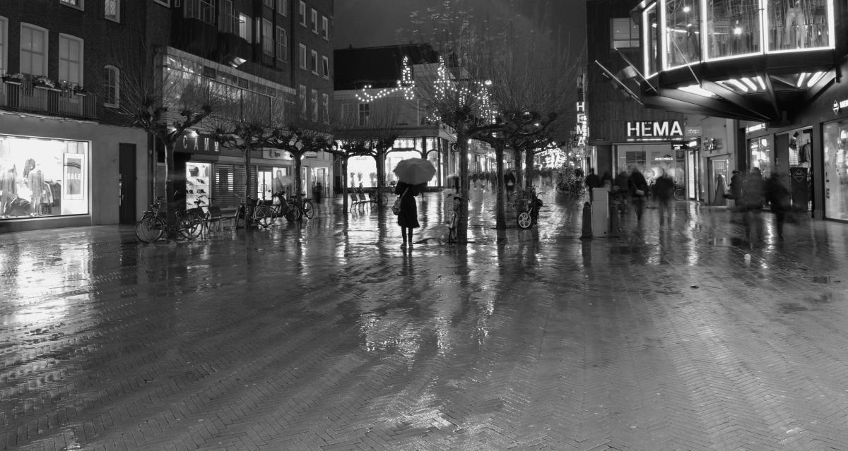 Deze foto heb ik gemaakt in Groningen tijden een regenbui. iedereen probeerde te schuilen. behalve deze mysterieuze dame. zij bleef midden op straat staan. Foto is gemaakt met langere sluitertijd