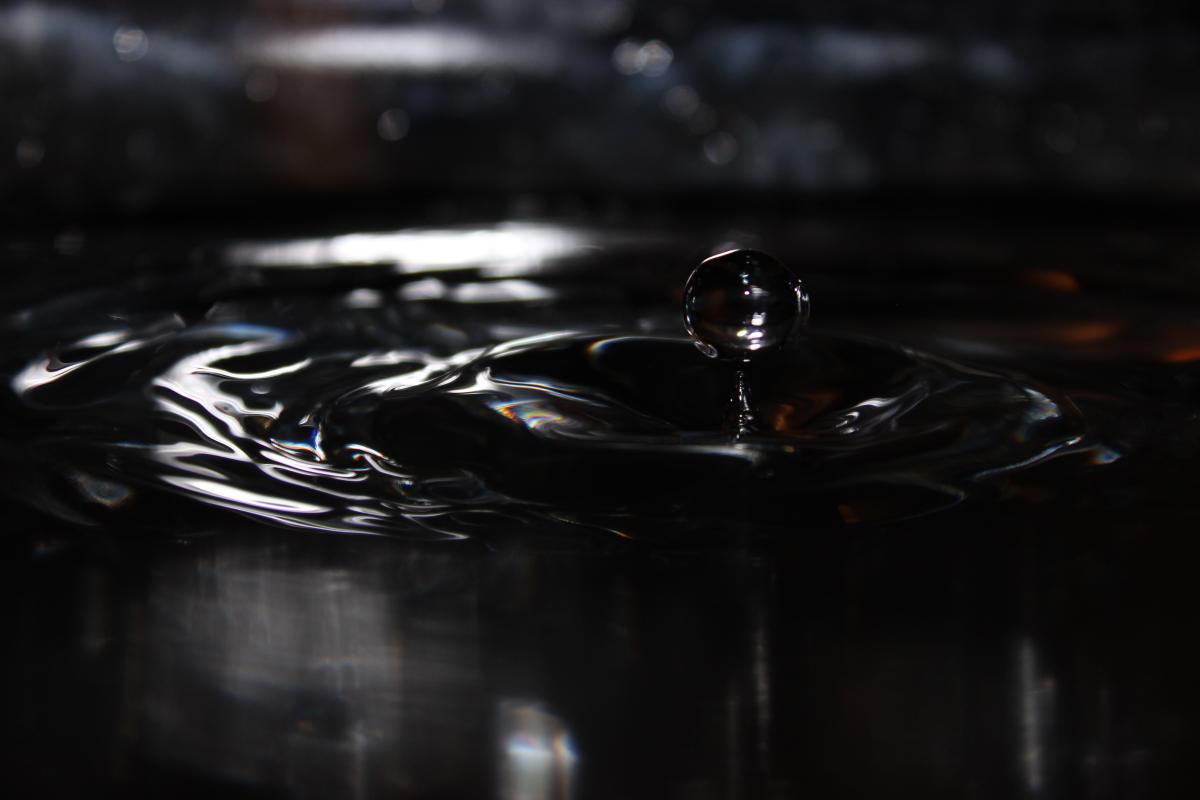 Deze foto is gemaakt toen ik net mijn spiegelreflexcamera had gekocht. Ik had een artikel gelezen over druppelfotografie in een fotoblad. Het interessante aan het verhaal vond ik dat je geen snelle sluitertijd nodig had om druppels te 'bevriezen', als je maar een snelle flitser hebt! En dat wilde ik natuurlijk graag testen. Met hulp van mijn broertje die met een spuitje vanaf een hoogte een heel aantal druppels liet vallen. Verder was het ook zijn idee dat de foto wat donkerder moest zijn. Toen hebben we onder de glazen bak een zwarte snijmat neergelegd, met dit als resultaat!