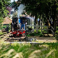 De stoomtrein Goes-Borsele passeert voormalig station Nisse op haar heenreis naar Hoedekenskerke. De locomotief passeert hier een bomenrij waardoor het licht mooi op de trein valt.