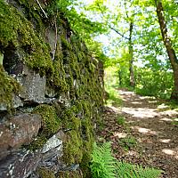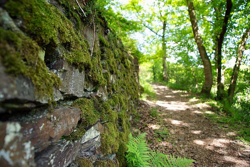 Een pad met een oude muur van een lang geleden vergane wijnbouw helling bij de Moezel Duitsland