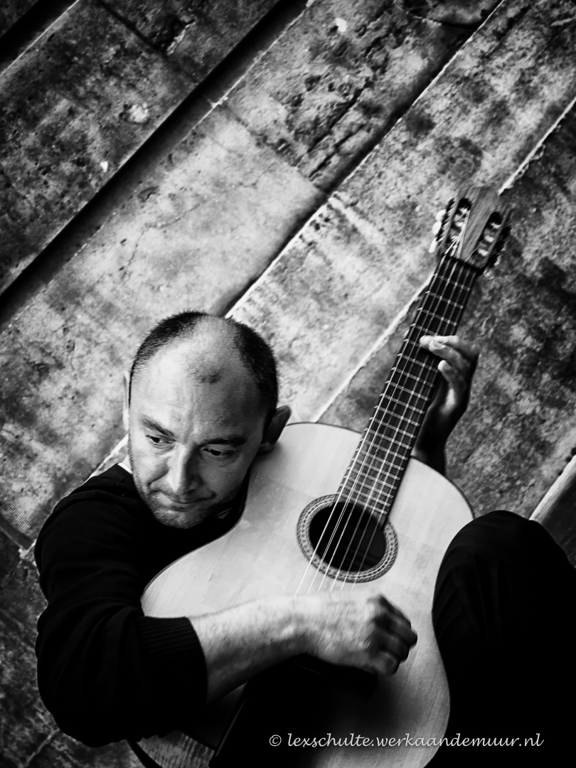 Een straatmuzikant ging helemaal op in zijn muziek. Uiteraard eerst wat geld in zijn bakje gedaan...