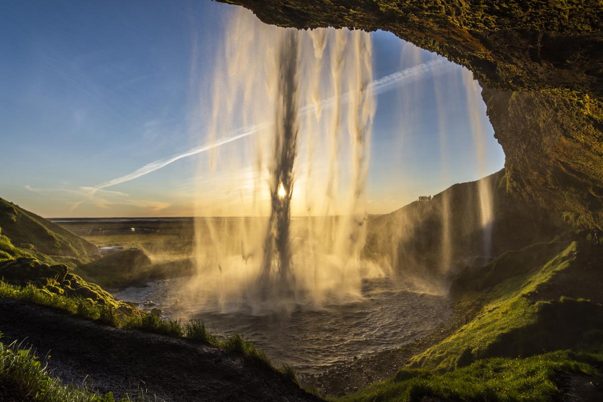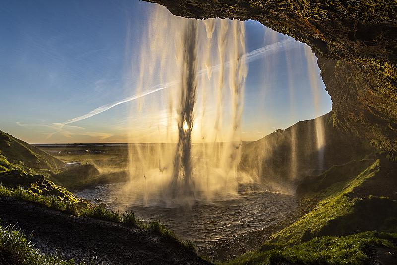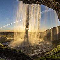 De beroemde Seljalandsfoss waterval tijdens een prachtige zomerse zonsondergang.