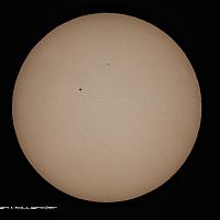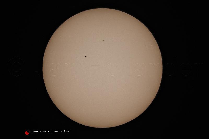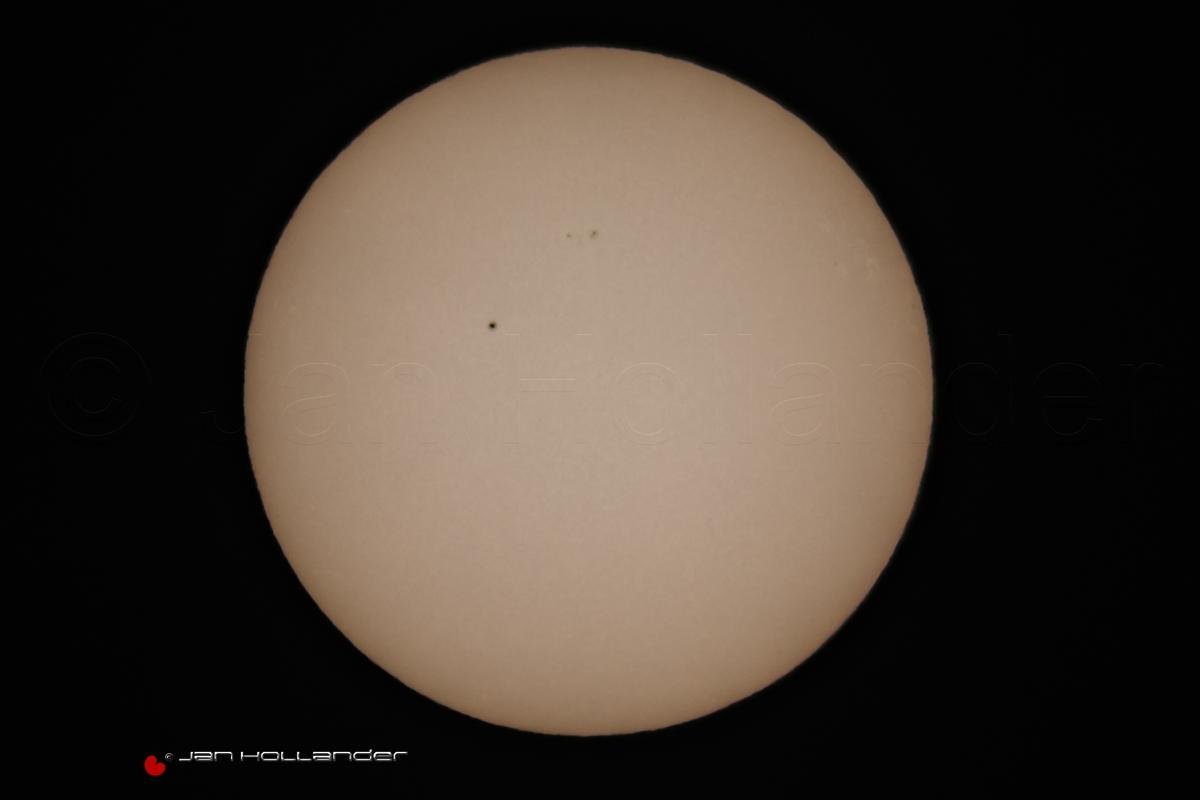 De zon met zonnevlekken van gisteren , gemaakt met een Sigma 70-300 en een Kenko extender 2X en een B&W big stopper en bijgesneden .