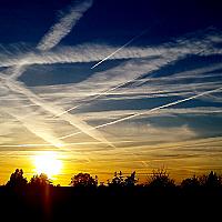 Condens strepen creëren een prachtige zonsondergang