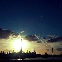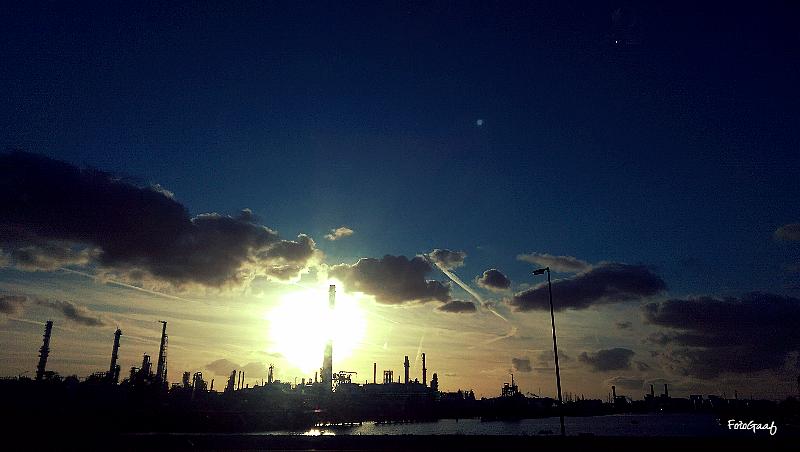 Het landschap van het Botlekgebied wordt gekenmerkt door de aanwezigheid van industrie. Met een ondergaande zon levert dit toch ook wel weer een mooi plaatje op.