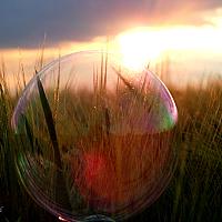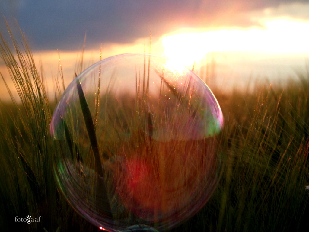 Middenin dit veld vol gerst maakte ik deze foto, een zeepbel, een prachtig mooie zonsondergang, dramatische wolken, een mooie horizon, de zon die weerkaast op het gerst, prachtig mooie combinatie.