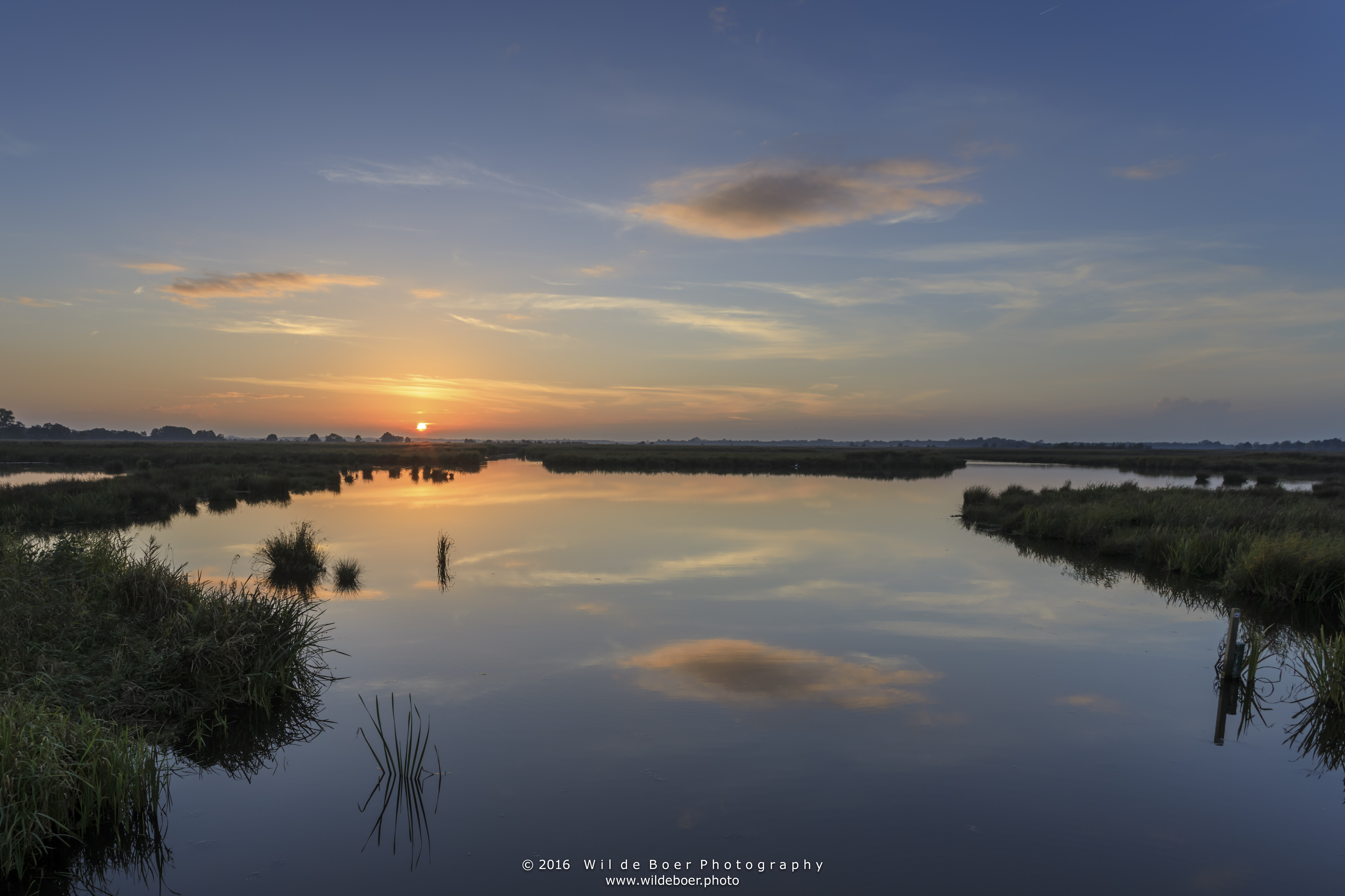 Zonsondergang in de Onlanden bij het Leekstermeer in Groningen