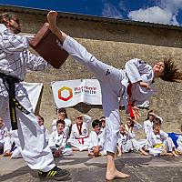 Deze foto is genomen tijden een taekwondo demonstratie in Frankrijk al waar is de fotograaf was. Lucie is hier aan het werk.