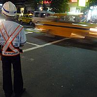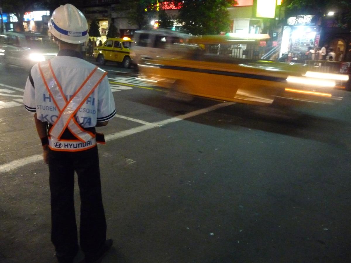 Verkeersregelaar en voorbij snellende taxi in Calcutta, India.