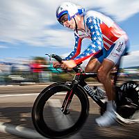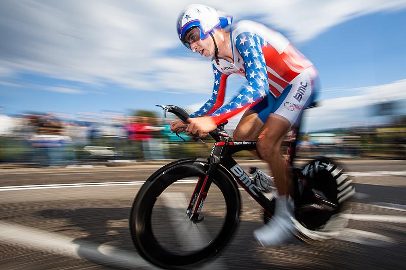 Taylor Phinney op de fiets tijdens de individuele tijdrit op het WK tijdrijden in Valkenburg, waar hij uiteindelijk 2e werd.