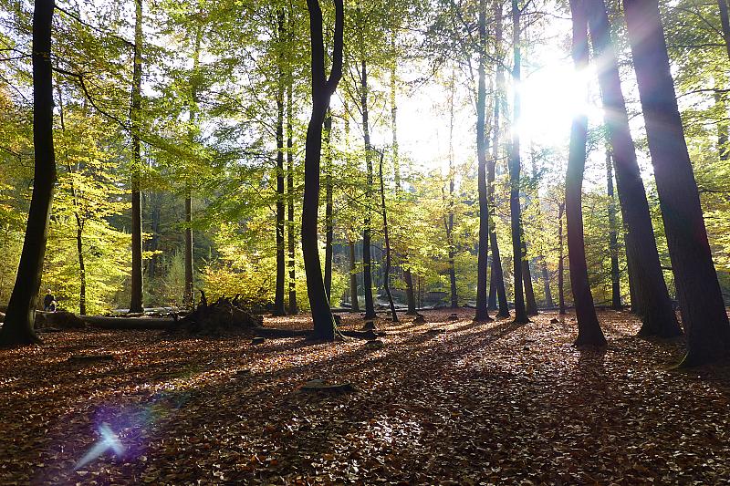 Op deze prachtige herfstochtend kwam de zon mooi tussen de bomen doorschijnen. Boomkroonpad bij Grolloo, Drenthe
