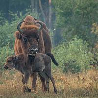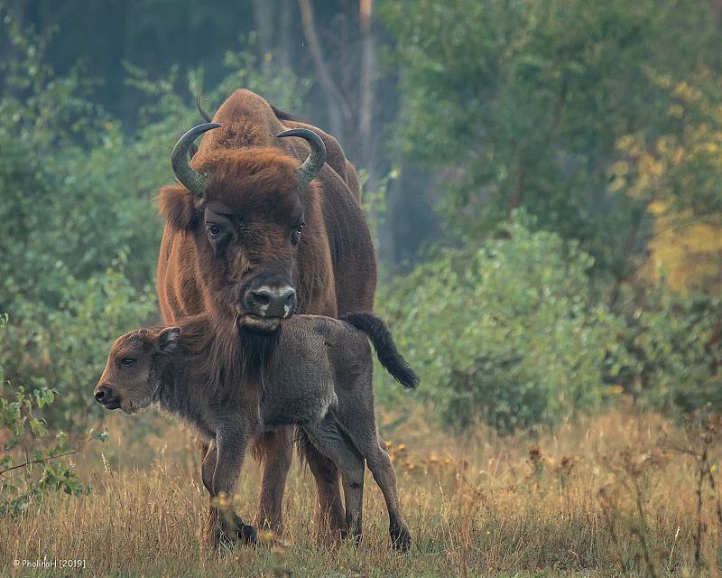 Pasgeboren wisent (Europese bizon) onder moeder's hoede in natuurgebied de Maashorst in Noord Brabant