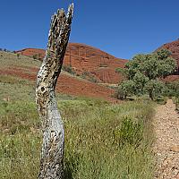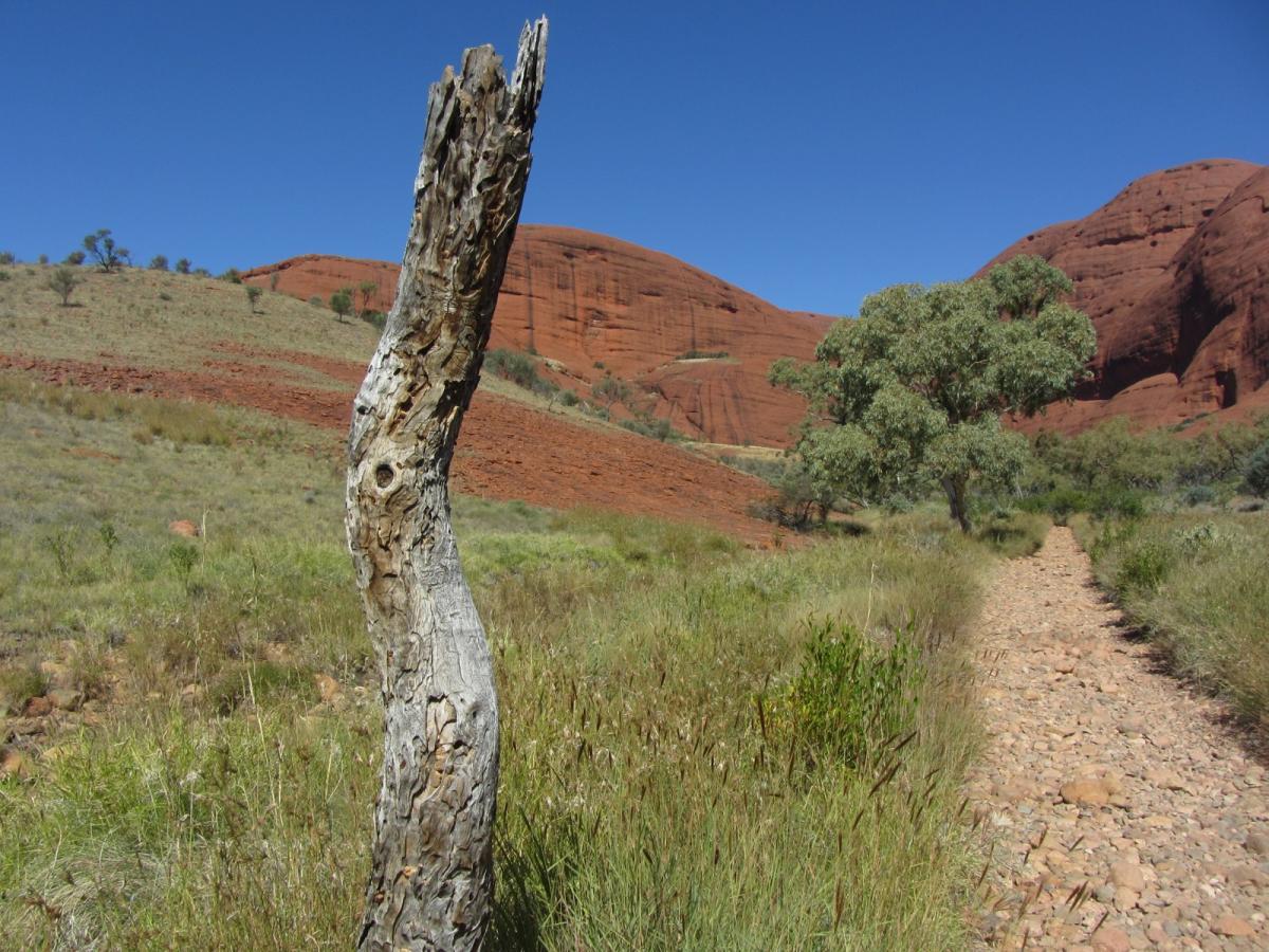 Al wandelend door het Kata Tjuta gebergte in Australië kwam ik onderweg deze eenzame tak tegen. Een door termieten aangevreten boom en door een bosbrand geveld. Zijn buurman op de achtergrond had duidelijk meer geluk. Hoewel... De scherpe uiteinden van de boomstronk steken mooi af tegen de rondingen van het gebergte op de achtergrond en de kleuren van de lucht, bergen en gras maken de foto echt af.