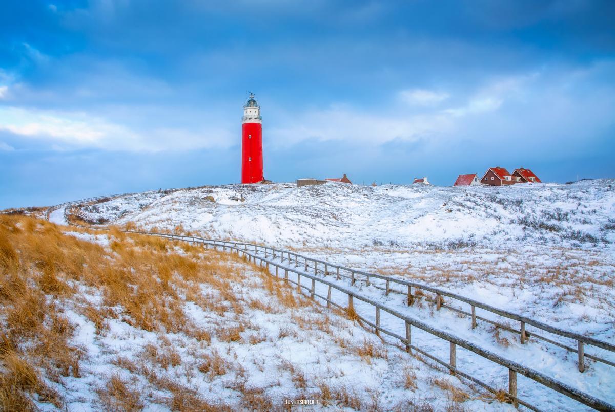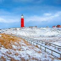 Texelse vuurtoren met sneeuw.