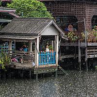 Een jongetje wat staat te kijken naar alle bootjes die in de harde regen voorbij komen. Dit is in het oude gedeelte van Bangkok waar alles nog is zoals heel Bangkok ooit was, houten huisjes op palen.