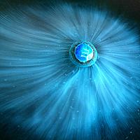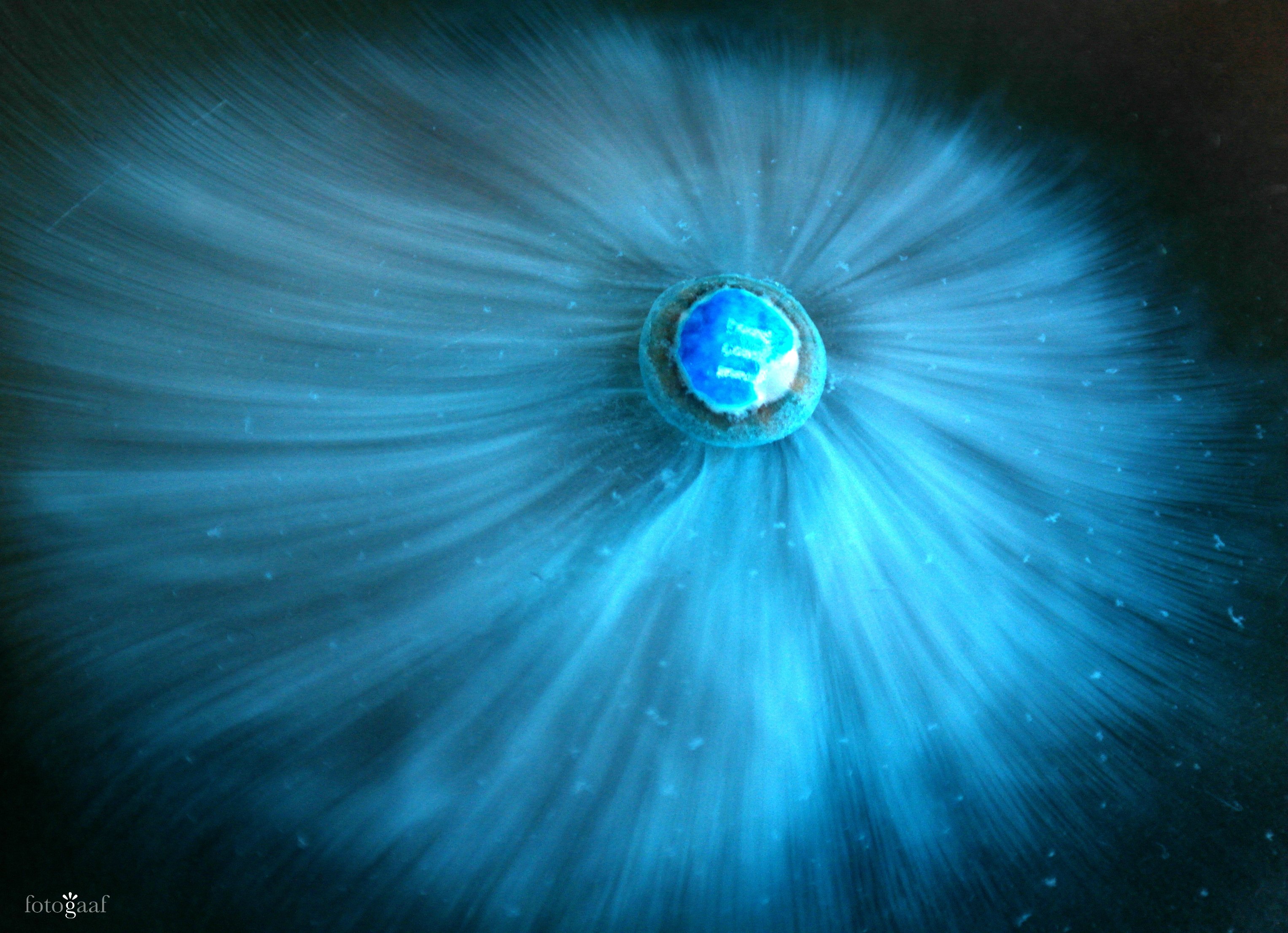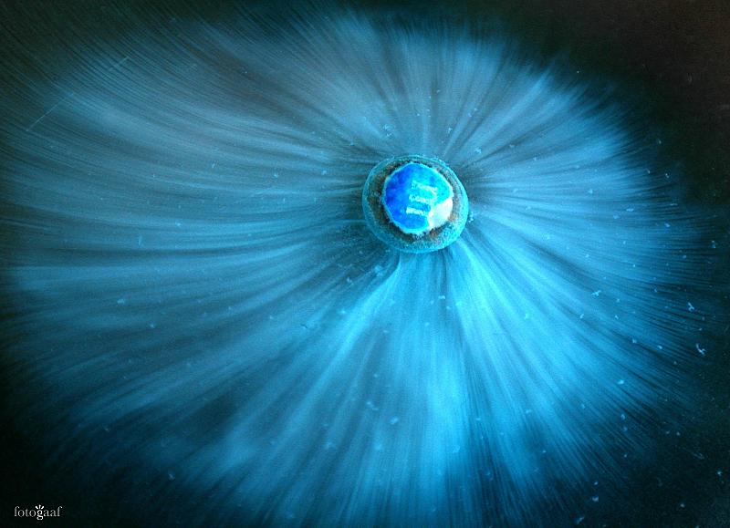 Eerst geeft het zijn kleurlaagje af en wordt het water smurfenblauw. Vervolgens waaiert het witte suikerlaagje uit tot een prachtige waaierstructuur.