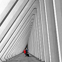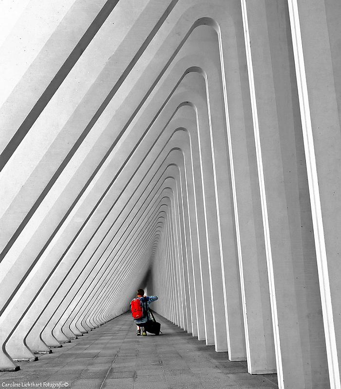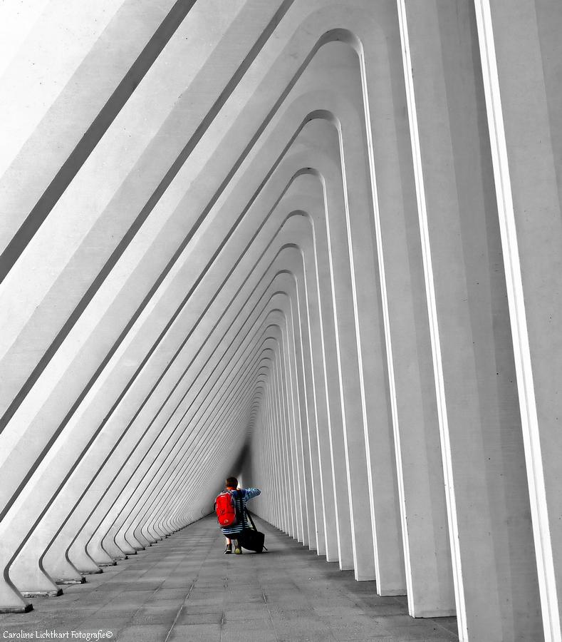 Het inmiddels bekende station Guillemins te Luik. Een fotogeniek gebouw waarvan hier een deel met in het midden van het beeld een knielende fotograaf.