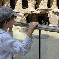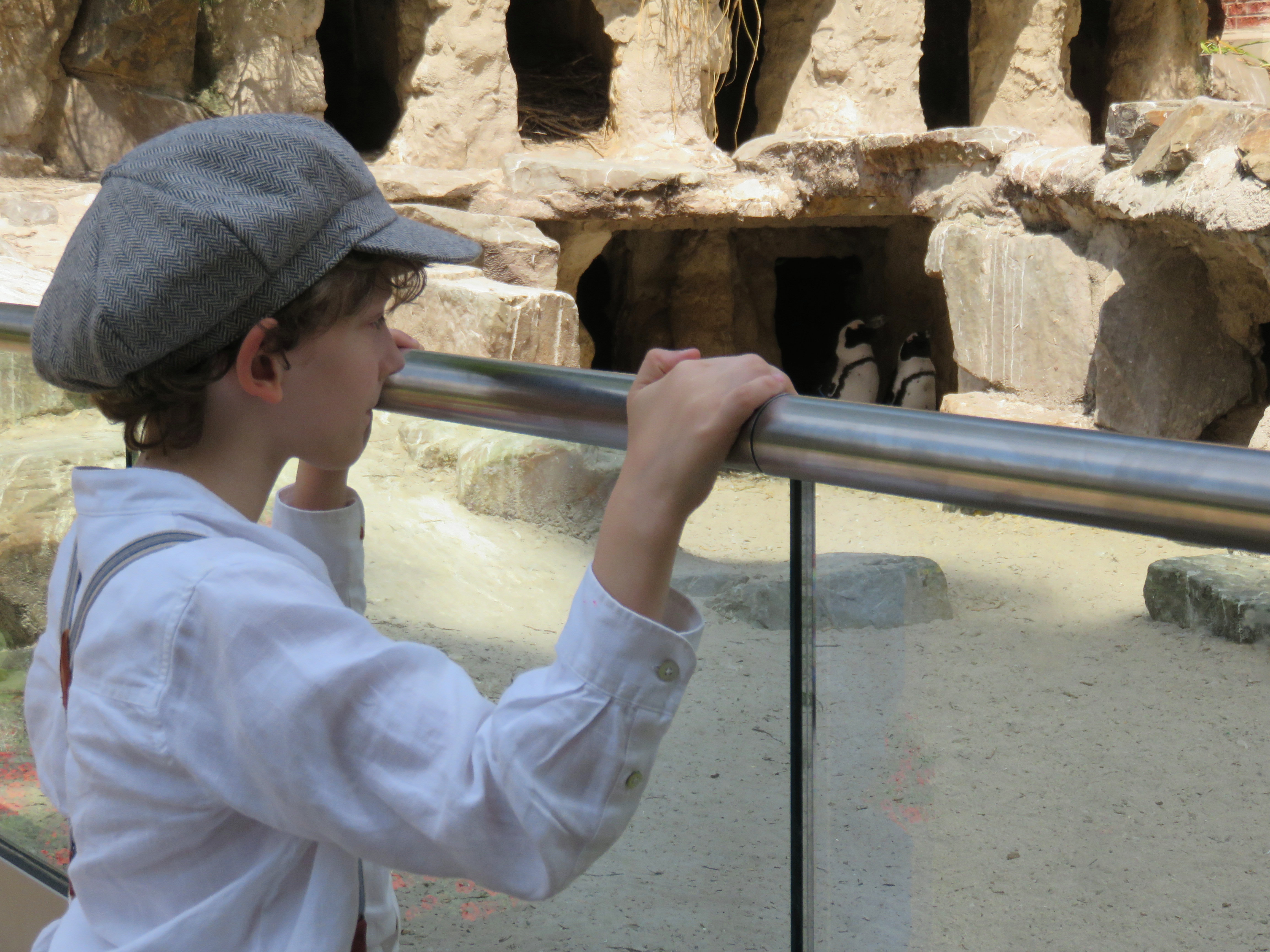 Deze jonge dierenvriend kijkt gefascineerd naar twee pinguïns en hoopt dat ze snel naar buiten komen.