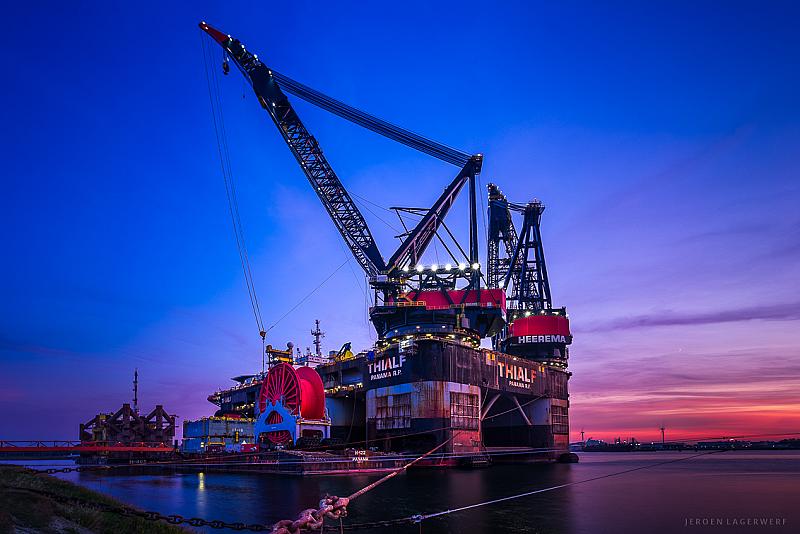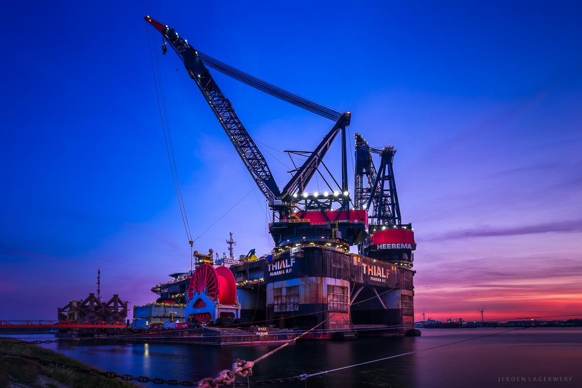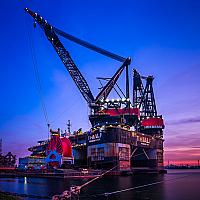 Kraanschip Thialf bij zonsondergang.